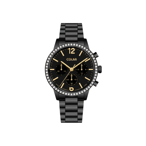 The Calyx Colmi Classic Range for Ladies delivers a striking blend of luxury and strength. Its polished black steel bracelet, gold detailing and crystal set bezel create an eye catching presence that feels powerful and refined. With a multi function chronograph design and impeccable finish, this watch offers a high end look that stands out in any setting. Perfect for women who enjoy a touch of glamour with everyday sophistication.